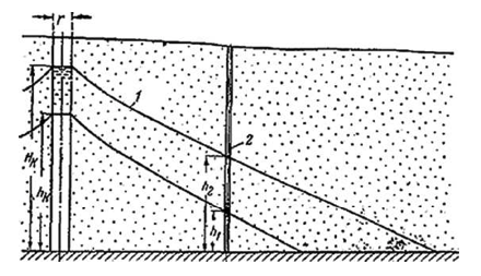 1 - кривая депрессии; 2 - наблюдательная скважина