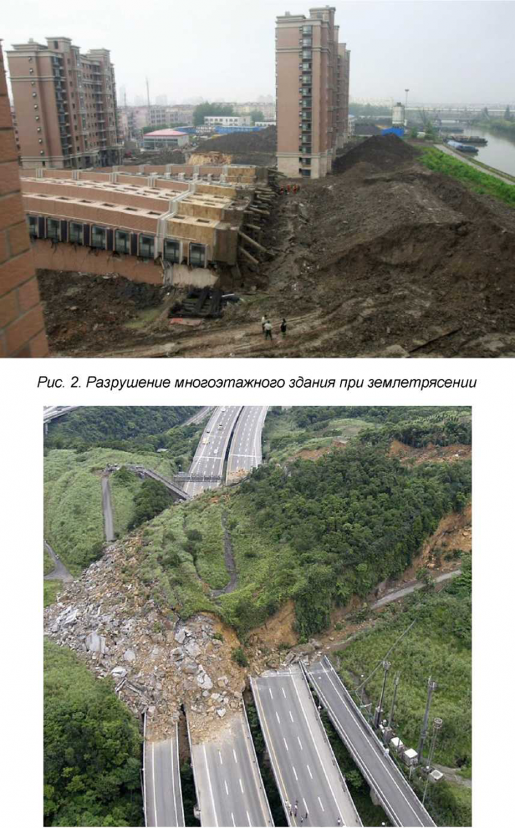 Рис. 1. Разрушение земляного полотна автомобильной дороги и подпорной стенки в результате оползня